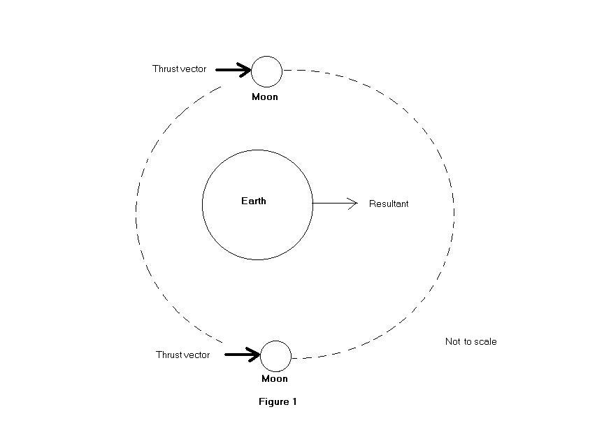 In figure 1, you can see the thrust vector being applied to the Moon at two points in it's orbit. The first of these impulses would increase the orbital velocity causing the moon to stay on that side of the Earth for a longer period than normal. The second impulse would restore it to it's normal orbital path for the second half of it's orbit.